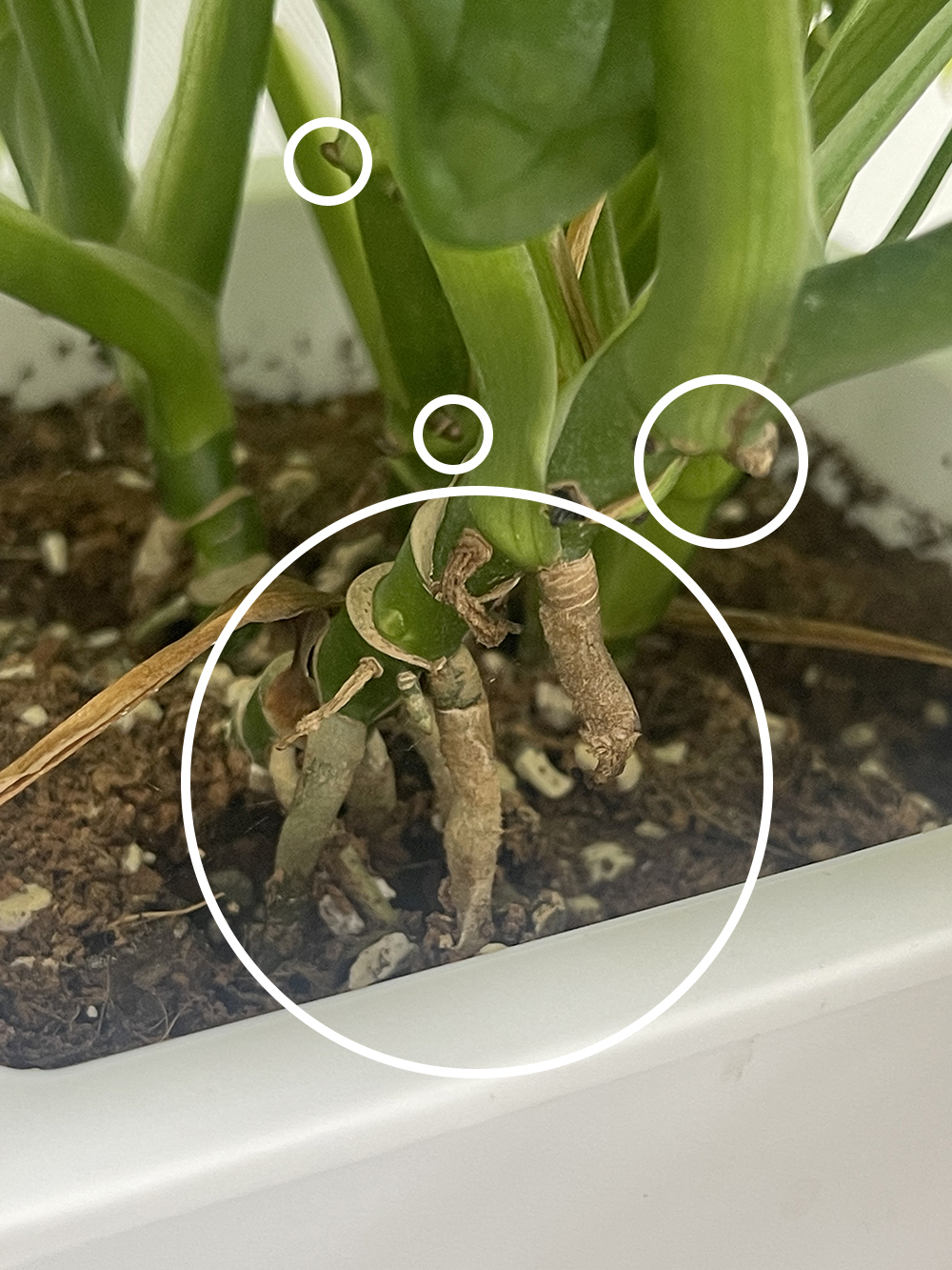 식물의 줄기 마디에서 작은 돌기들이 돋아나기 시작했다는 것은 공중뿌리가 자라고 있다는 의미입니다. 공중뿌리는 흙 속에서 자라는 뿌리와 같은 조직으로 이루어져있기 때문에 실직적으로는 그냥 뿌리와 같다고 볼 수 있습니다. 공중뿌리 역시 물을 흡수할 수 있고 줄기를 지지할 수 있으며 지속적으로 자라날 것입니다.